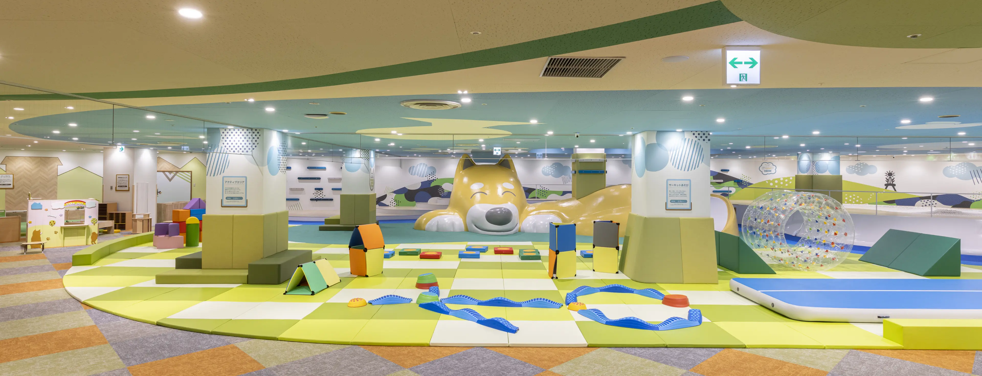 柔らかい床と壁に囲まれた、はじめてのあそびにぴったりのコーナーです。乳幼児の興味を引くしかけをたくさん用意して、さまざまな動きを促します。