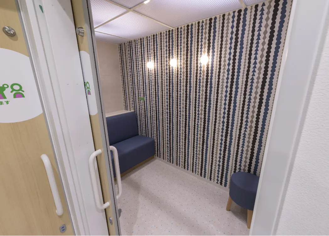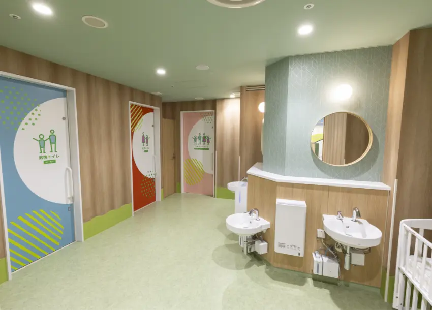 お子様の年齢に合わせたキッズトイレや、家族でも利用しやすい広々としたファミリートイレを設置しています。おむつ替えスペースや授乳室も併設しています。